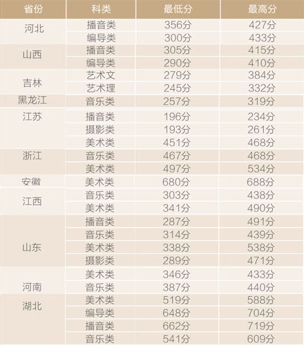 使用艺术类省统考成绩录取的省份,按该省有关政策执行,如所在省份没有明确规定,则按照文化分和专业分各占50%的比例录取,计算方式为:文化成绩×50%+专业成绩×50%,从高分到低分择优录取。
