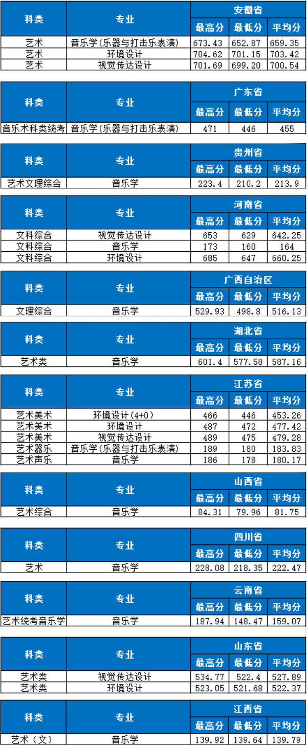 (1)音乐类:按省统考成绩录取,考生各项成绩达到所在省相应批次投档要求,以专业成绩排序,根据计划按“分数优先、遵循志愿”的原则录取,如相同则以文化分高者优先,再相同者以语文和外语总分高者优先。