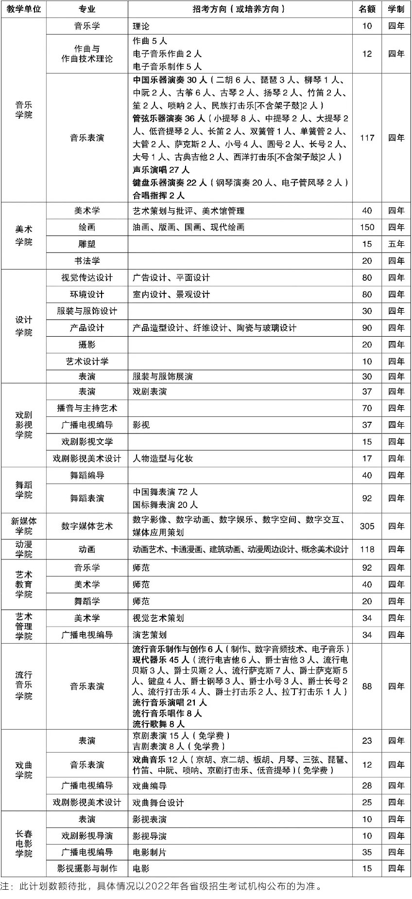 ②书法学、戏剧影视导演(影视导演)、作曲与作曲技术理论(含电子音乐作曲和电子音乐制作)、音乐表演(中国乐器演奏、管弦乐器演奏、声乐演唱、键盘乐器演奏、合唱指挥、流行音乐制作与创作、现代器乐、流行音乐演唱、流行音乐唱作、流行歌舞、戏曲音乐)、表演(戏剧表演、影视表演、服装与服饰展演、京剧表演、吉剧表演)、舞蹈编导、舞蹈表演(中国舞表演、国标舞表演)、舞蹈学(师范)专业,以专业成绩择优录取。