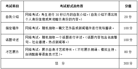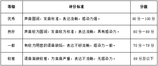 通过文艺作品或新闻稿件考查学生的普通话语音基础水平、语言感受及表现能力;判断学生是否具备理解及表达作品的基本能力;是否符合学习本专业的基本条件。