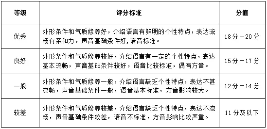 按照广播、电视以及新媒体等电子传媒受众的基本审美标准,通过自我介绍的个性化展示,综合考查考生的外形条件、气质修养、上镜效果、肢体副语言运用情况。