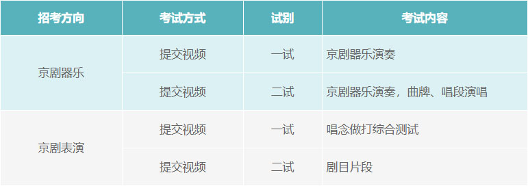 注:1.京剧表演、京剧器乐专业一、二试考试视频同时提交,提交视频具体要求详见招生网站相关信息。