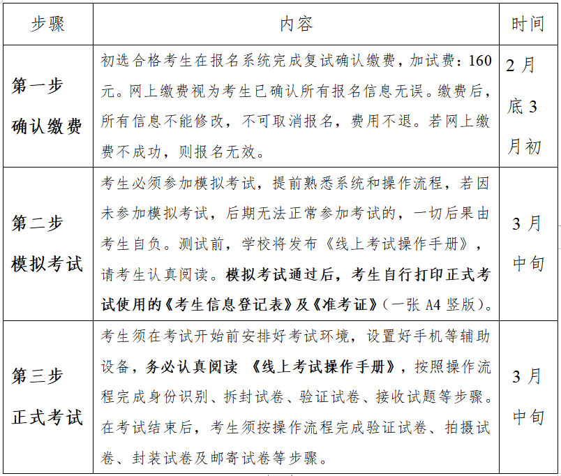 初选合格考生须在规定的时间,按要求完成复试确认缴费、模拟考试及正式考试三个步骤,所有步骤逾期均不予补办。