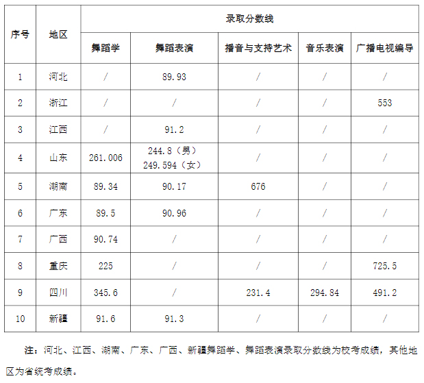 舞蹈学、舞蹈表演专业:开展校考的地区录取原则为在投档考生中,按照我校舞蹈类专业校考成绩从高分到低分择优录取;其他地区录取原则为投档考生中,按照省级招生部门组织的相关专业统考成绩从高分到低分择优录取; 美术高考集训画室