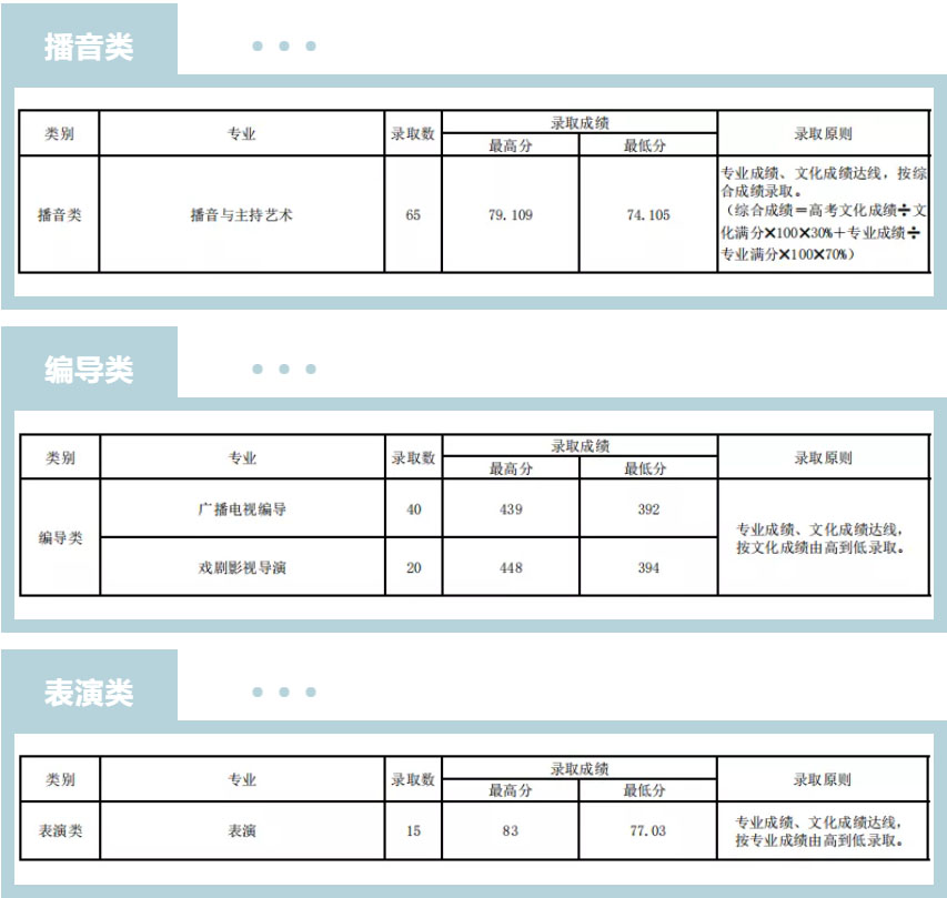 6.播音主持艺术专业在河北、黑龙江、安徽、山东、河南和甘肃等省份使用校考成绩,其他省份使用当地播音主持类统(联)考成绩。平行志愿投档的省份按投档成绩由高到低录取;非平行志愿投档的省份按进档考生综合成绩由高到低录取(综合成绩=高考文化成绩÷文化满分×100×30%+专业成绩÷专业满分×100×70%)。