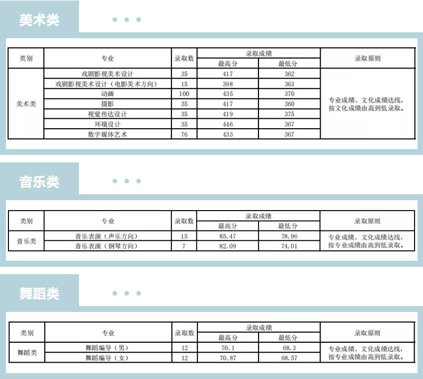 1.动画、数字媒体艺术、戏剧影视美术设计、戏剧影视美术设计(电影美术方向)、摄影、环境设计和视觉传达设计等专业使用当地美术设计类统考成绩。平行志愿投档的省份按投档成绩由高到低录取;非平行志愿(顺序志愿、梯度志愿等,以下同)投档的省份按进档考生高考文化成绩由高到低录取。