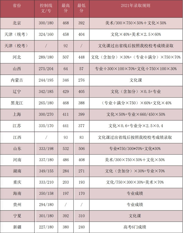 北京工业大学耿丹学院2021年美术类本科专业录取分数线
