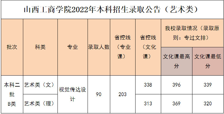 山西工商学院2022年山西省艺术类本科专业录取分数线