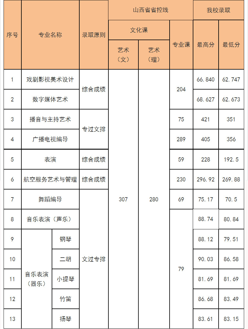 2.数字媒体艺术、戏剧影视美术设计专业使用山西省美术类统考成绩,进档考生按综合成绩从高到低择优录取,综合成绩=专业成绩÷300×100×70%+文化成绩÷750×100×30%。