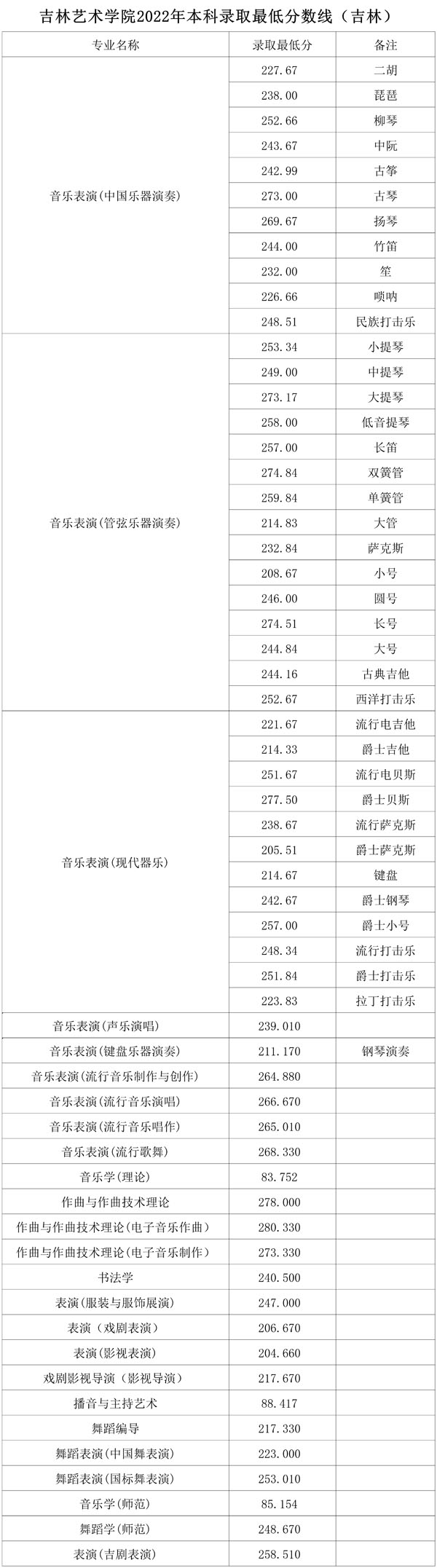 吉林艺术学院2022年其他艺术类专业录取分数线