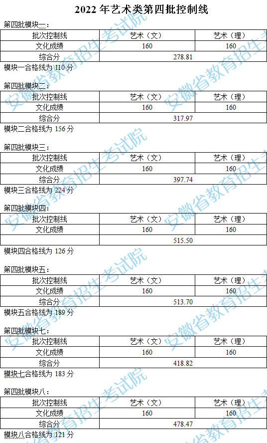 2022年安徽省艺术类第四批录取控制分数线(高职专科)