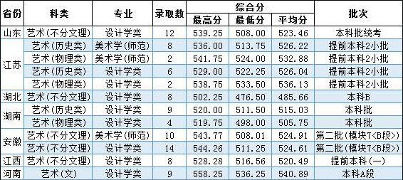 湖南省:设计学类,美术-历史类295.3分、美术-物理类286.4分,平行组投档分= 文化成绩(含加分)*0.3+统考成绩*0.7