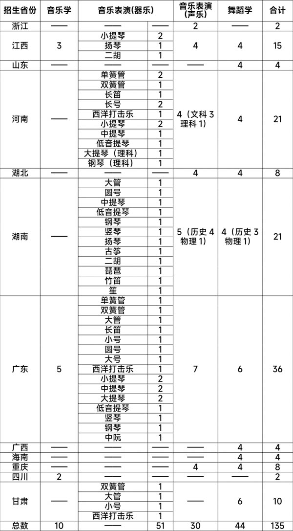 艺术学院本科招生计划为135人,本科招生专业包括音乐学、音乐表演、舞蹈学3个专业,授予艺术学学士学位,学制为全日制本科4年。