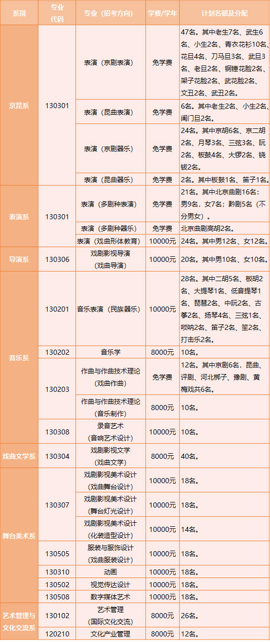 注:戏剧影视文学(戏曲文学)、艺术管理(国际文化交流)专业按照普通类专业招生,不设校考,直接使用高考文化成绩录取。戏剧影视美术设计(戏曲舞台设计)、戏剧影视美术设计(舞台灯光设计)、戏剧影视美术设计(化装造型设计)、服装与服饰设计(戏曲服装设计)、动画、视觉传达设计、数字媒体艺术专业不设校考,使用省级美术学和设计学类统考成绩和高考文化成绩录取。文化产业管理专业为普通类专业,不设校考,直接使用高考文化成绩录取。以上专业具体分省计划以各省教育考试院公布的文件为准。