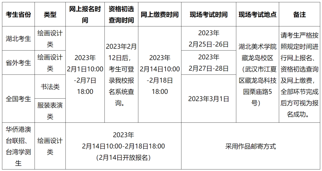 欢迎报考湖北美术学院!现将我校2023年普通本科招生专业考试(简称“校考”)绘画设计类、书法类、服装表演类报名事宜公告如下: