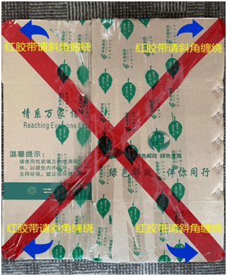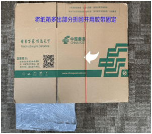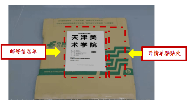 请考生携带《天津美术学院邮寄信息单》、《诚信考试承诺书》、复试准考证以及已经用塑料包装袋密封好的试卷在考试当天17:00前,到邮政营业网点进行交寄,书法类的考生如当天来不及寄出,可在第二天(3月10日)上午10:00前将试卷寄出,使用中国邮政5号箱(规格长50cm/宽30cm/高30cm)按下图所示进行二次包装加固(试卷统一放置在图示位置),并根据邮政网点交寄要求,美术培训学校将邮寄信息单粘贴在邮寄外包装上显著位置(如下图所示),并用胶带纸覆盖,注意:胶带不得遮盖条形码,一律以邮政EMS特快专递产品邮寄(寄递要求参照当地邮政规范寄递要求)。