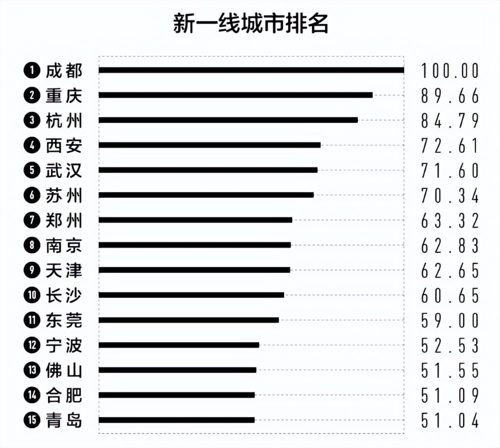 日前,第一财经·新一线城市研究所发布《2022城市商业魅力排行榜》,2022年新一线城市依次是:成都、重庆、杭州、西安、武汉、苏州、郑州、南京、天津、长沙、东莞、宁波、佛山、合肥和青岛。