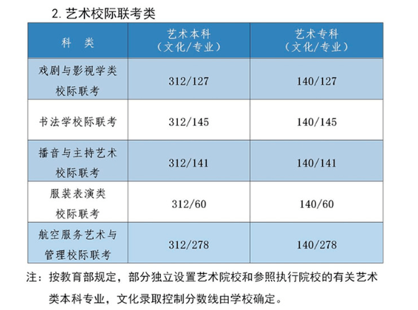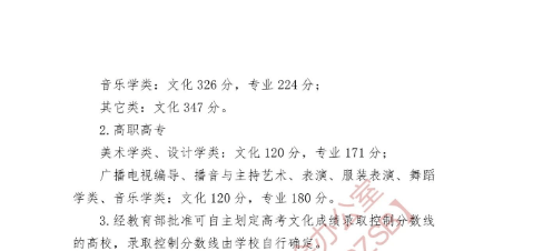 3.专业成绩控制线:省统考美术专业成绩最低控制线为211.00分;音乐专业成绩最低控制线为75.00分;舞蹈专业成绩最低控制线为65.00分;表演专业成绩最低控制线为74.00分;书法学专业成绩最低控制线为71.00分。省联考播音与主持专业成绩最低控制线为81.00分;广播电视编导及戏剧影视文学专业成绩最低控制线为306.00分;航空服务艺术与管理专业成绩最低控制线为260.00分。