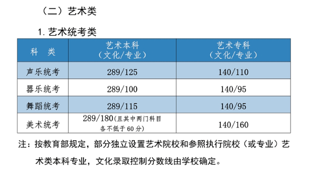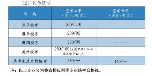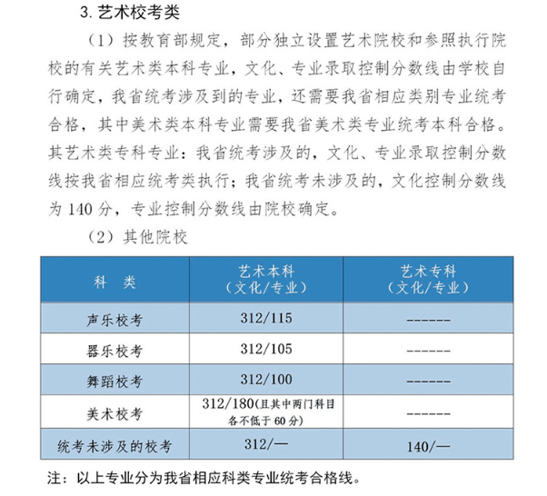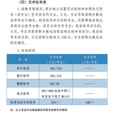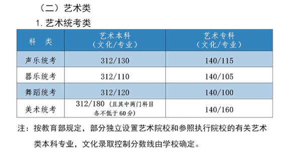 3.艺术类本科批专业课录取控制分数线:美术与设计学类180分,音乐学类110分,戏剧与影视学类140分,舞蹈学类200分,书法学专业140分。