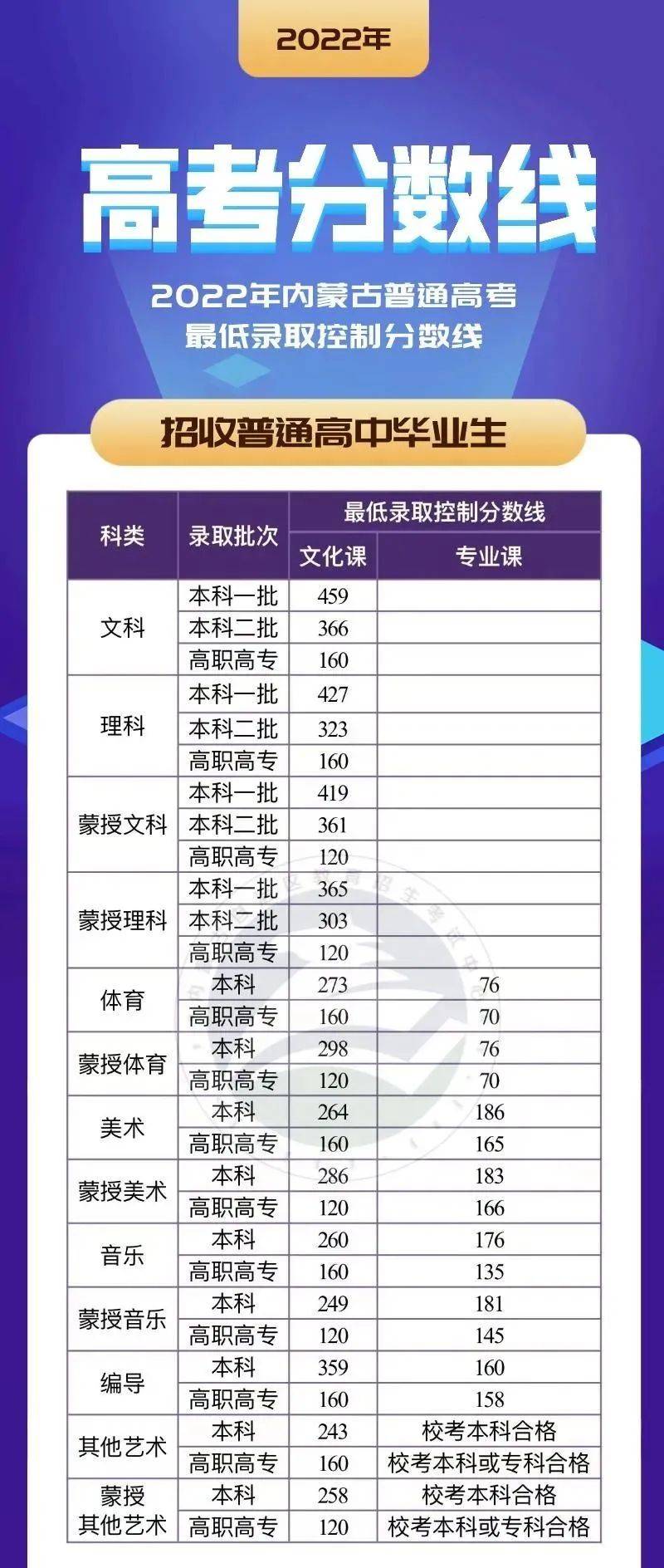 2.艺术类高职(专科)批文化课录取控制分数线:文艺150分,理艺150分。