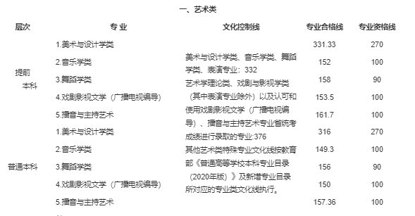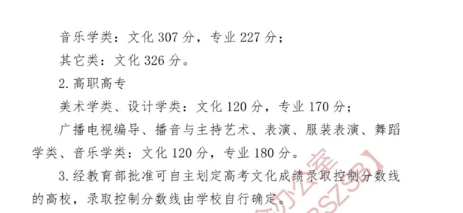 美术与设计学类、音乐学类(声乐)、音乐学类(器乐)、舞蹈学类、表演等专业本科文化线:330分;
