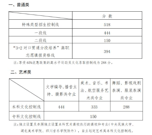 2020年我省艺术、体育类各批次文化录取控制分数线为:
