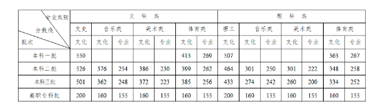 省统考:美术专业203.00分;音乐专业74.00分;舞蹈专业67.00分;表演专业67.00分;书法学专业73.00分。省联考:播音与主持专业79.00分;广播电视编导及戏剧影视文学专业298.00分;航空服务艺术与管理专业244.00分。