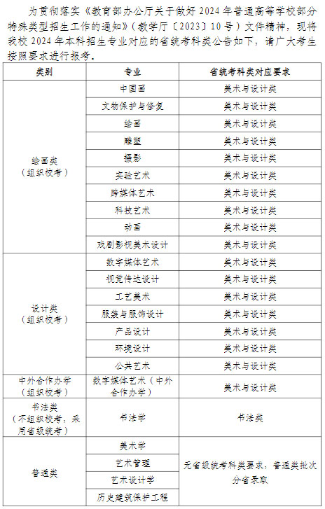 天津美术学院2024年本科招生专业省统考科类对应要求
