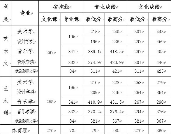 2017年在河北省计划录取艺术类考生42人,目前全部录取满额。其中,美术学5人,录取最高182分,录取最低164分;设计学类31人,录取最高184分,录取最低160分;戏剧影视文学6人,录取最高161分,录取最低153分。