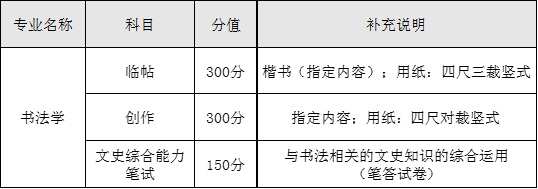 (3)初试内容:初试主要考查考生是否具备基本书写能力以完成专业考试。初试时需提交本人近期独立完成的作品一幅。作品的具体要求为:尺寸为四尺对裁竖式,落款并钤印,作品左下角注明姓名及报名号,内容不限。初试结果将现场通知考生,初试成绩不计入最终成绩。